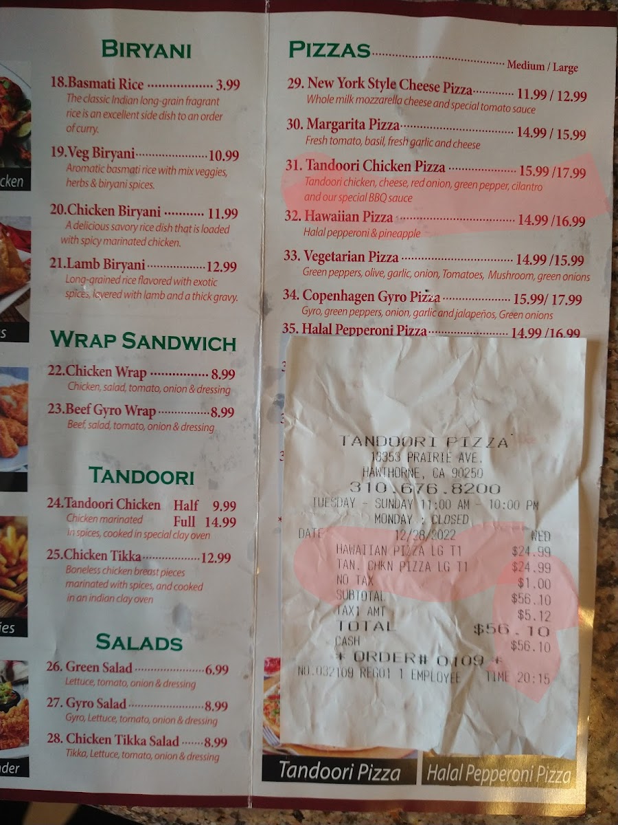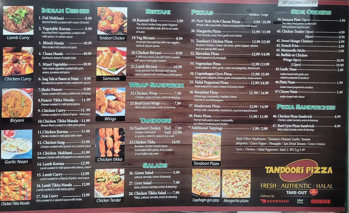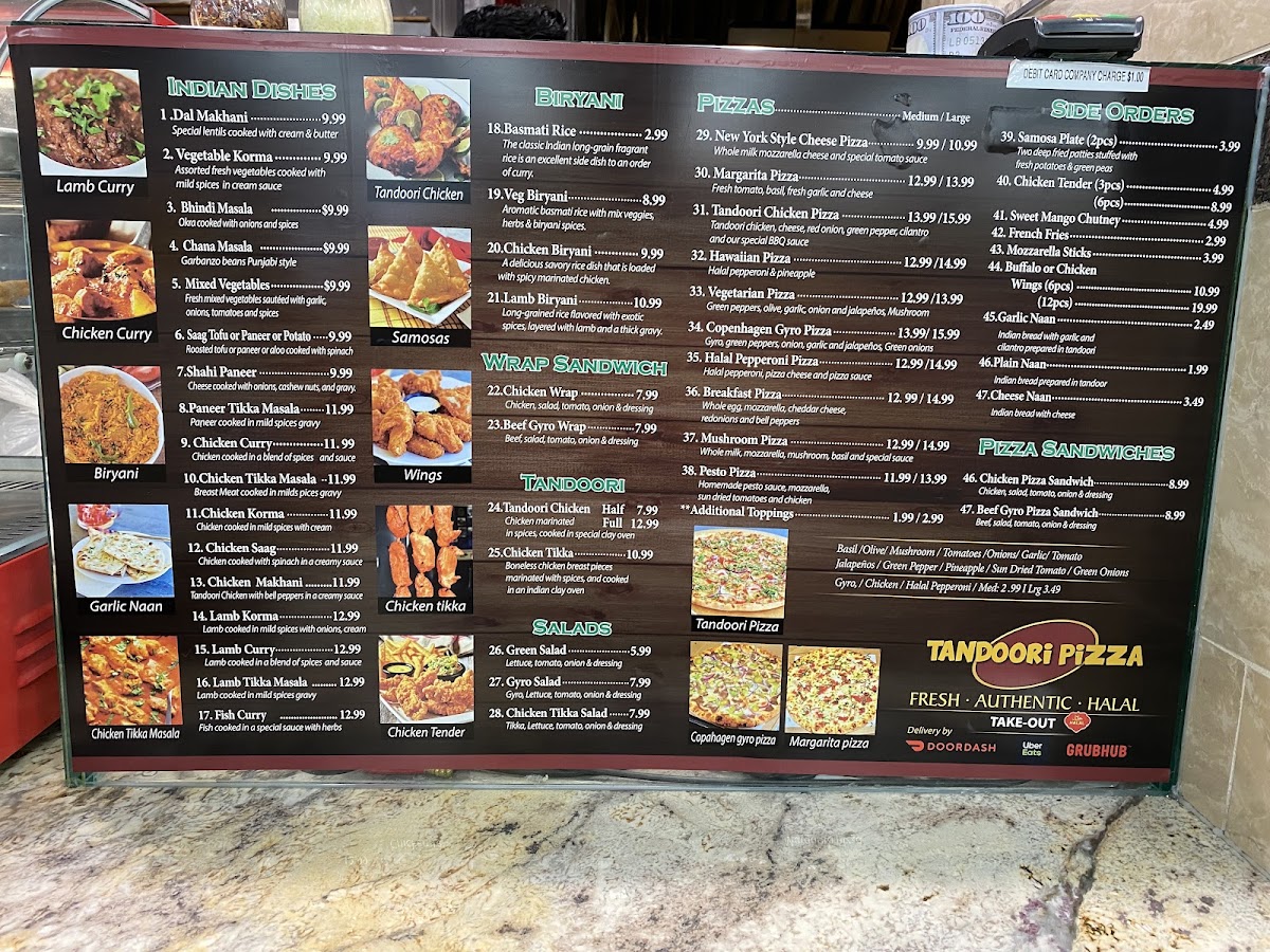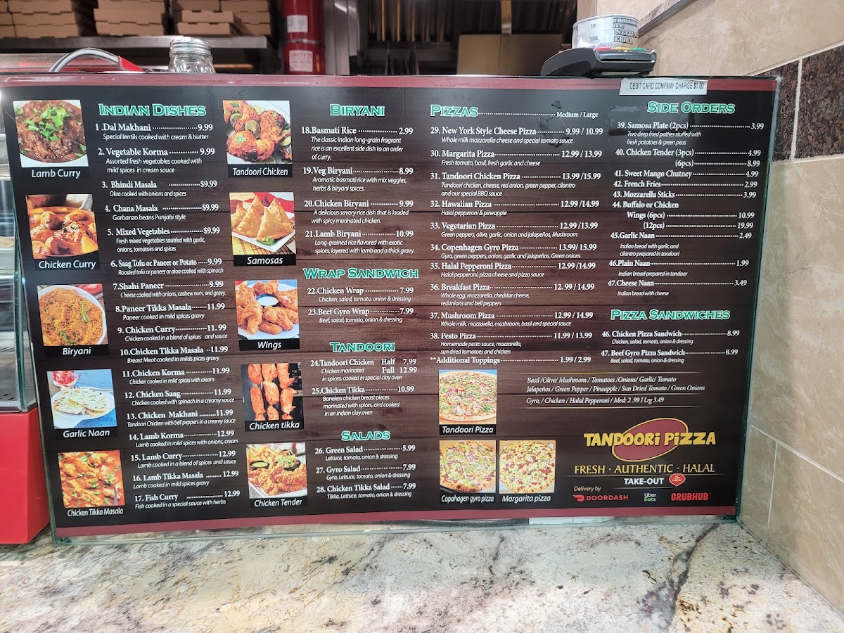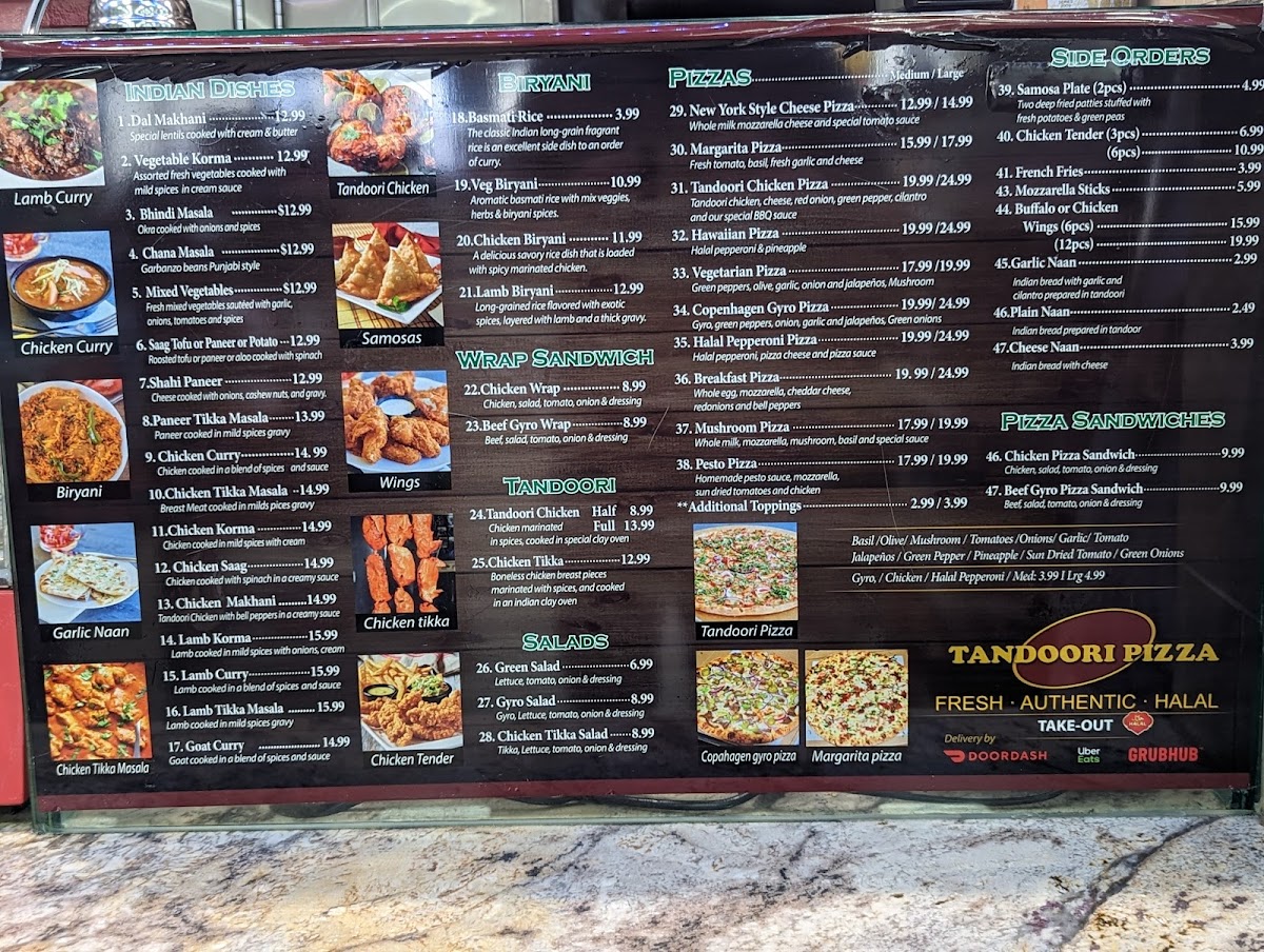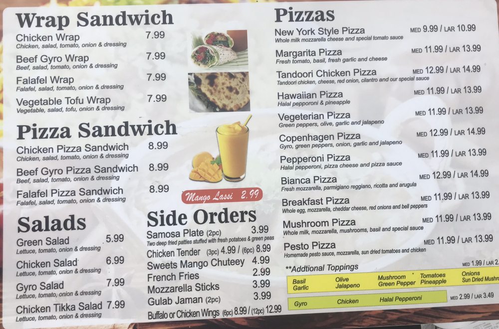 Tandoori Pizza offers a diverse menu that blends traditional Indian flavors with classic favorites. Their biryanis include Chicken Biryani and Veg Biryani, both known for their aromatic basmati rice. For a quick bite, try their Beef Gyro Wrap Sandwich, which combines savory beef with fresh ingredients. The salad selection features refreshing options like the Green Salad, Gyro Salad, and Chicken Salad, perfect for a lighter meal. Pizza lovers can enjoy a range of unique pizzas such as the Tandoori Chicken Pizza, Vegetarian Pizza, and Halal Pepperoni Pizza, along with a special Copenhagen Gyro Pizza and classic Margarita Pizza. If you're in the mood for something more handheld, the Chicken Pizza Sandwich and Beef Gyro Pizza Sandwich are tasty options. For sides, there's the crispy 2 Piece Samosa Plate, juicy Chicken Tenders, golden French Fries, and both Buffalo Wings and Chicken Wings for those craving something spicy. To wash it all down, opt for a refreshing Mango Lassi or a Soda (available in 2L bottles). With such a wide variety of options, Tandoori Pizza caters to all tastes, blending familiar comfort food with exciting new twists.